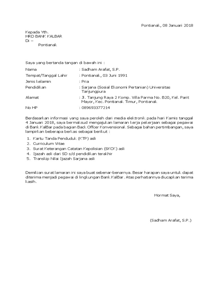 Isi surat lamaran kerja baik untuk bank swasta atau bank nasional sebenarnya tidak jauh berbeda. Demikian surat lamaran kerja yang saya buat, besar harapan saya untuk bisa bergabung di perusahaan yang bapak/ibu pimpin,saya akan melakukan yang terbaik untuk bank. Contoh surat lamaran kerja bank bni. Membuatnya sendiri tidaklah terlalu susah, kurang. Contoh surat lamaran masuk kerja di bank mandiri. 23 full pdfs related to this paper. Hindari adanya kesalahan dalam penulisan yang akan. Guna mengisi lowongan kerja sebagai karyawan di berbagai perusahaan seperti bank, bumn. Ga usah susah susah copas contoh surat lamaran kerja di bank di atas gan, contohsuratindonesia.com juga menyediakannya dalam format.doc (microsoft word document). Semoga contoh dibawah ini menjadi contoh yang baik dan benar. Surat lamaran pekerjaan yang baik akan mendatangkan kesan yang baik pula. Kepala hrd bank negara indonesia cabang jombang. Padahal, ada banyak hal yang harus kamu perhatikan.