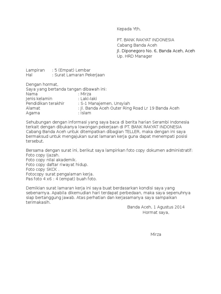 Menyebutkan posisi yang diinginkan dalam bank tersebut (sesuaikan dengan lowongan. Akan tetapi, terkadang kita luput bahwa hal yang esensial bukan hanya soal ketertarikan kita pada pekerjaan yang dilamar. Perhatikan juga ketentuan yang disyaratkan oleh instansi. Bergabung di perusahaan yang bapak/ibu pimpin, saya akan melakukan yang terbaik untuk bank bni. Berikut ini adalah beberapa contoh surat lamaran kerja di bank yang bisa anda jadikan bahan referensi dalam menulis contoh surat yang baik dan jika anda ingin bekerja di bank, maka tentunya harus mempersiapkan surat lamaran kerja bank.